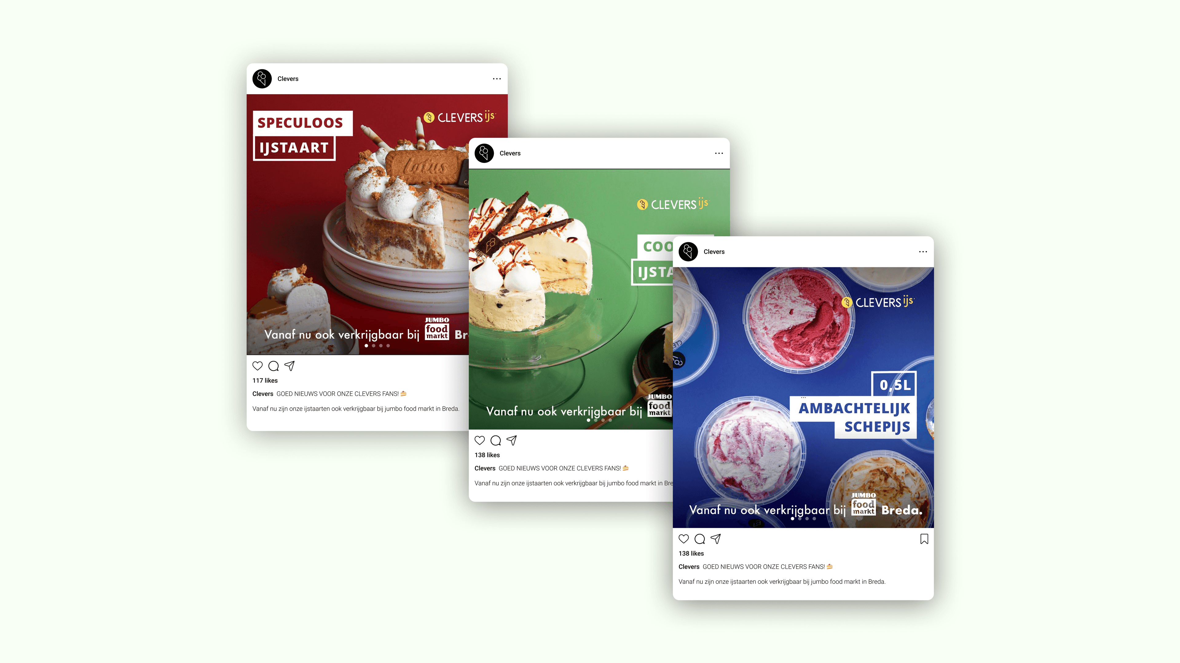 Promotionele social media posts voor de ijstaarten van Clevers.